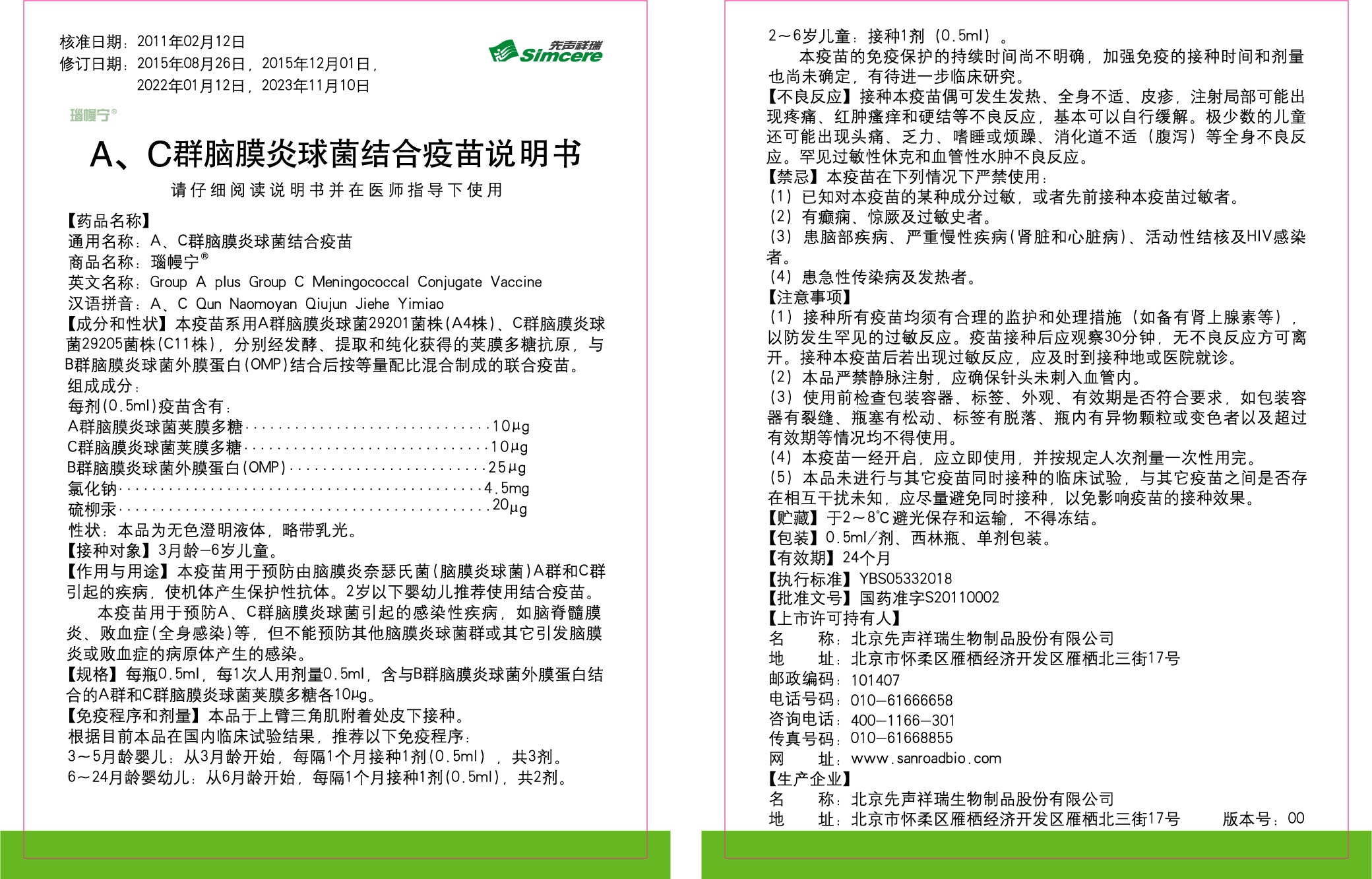 通用名稱:A、C群腦膜炎球菌結(jié)合疫苗